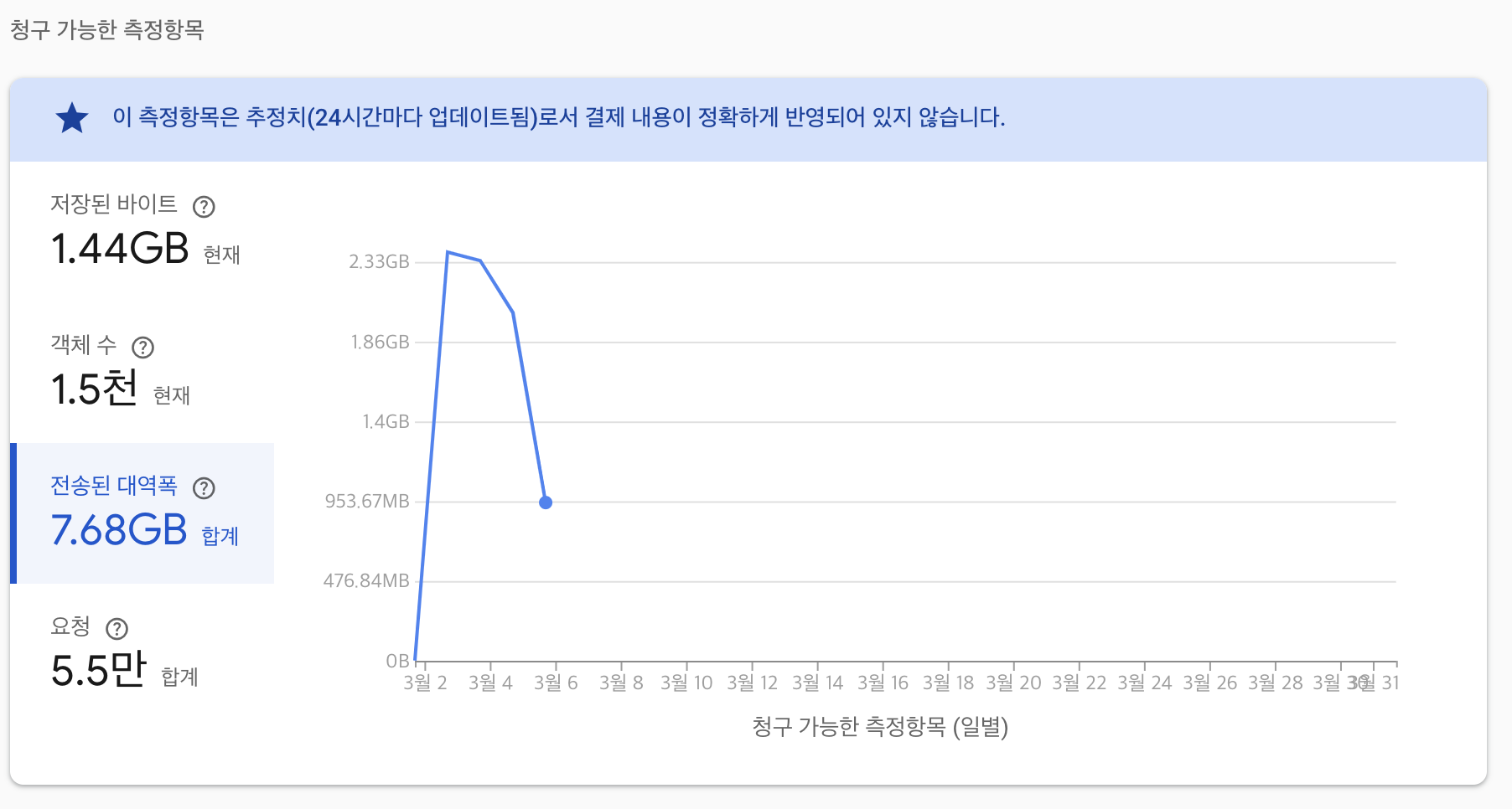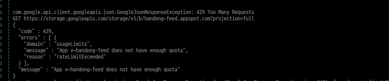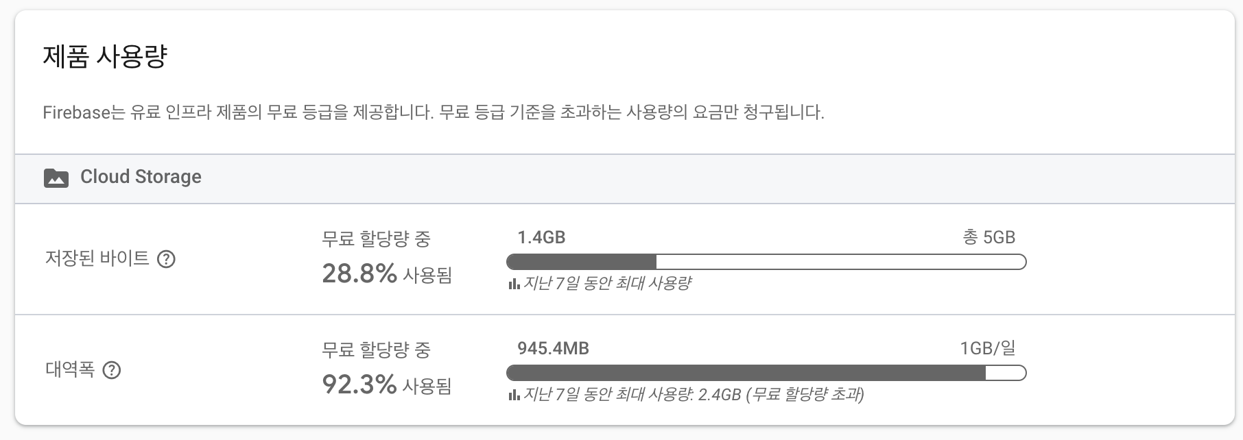 어느순간 로딩 시간이 엄청 늘어나더니 이미지 로딩이 안 되는 것을 확인하였습니다. 바로 서버 로그를 확인해 보니 Firebase Usuage Limit 초과했다는 메시지와 함께 대역폭이 많이 사용되었다는 것을 알 수 있었습니다 (내 돈 ㅠㅠ)